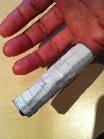 and let me tell you from experience, hand and finger injuries suck! ordinary things like brushing your teeth, washing your face, wiping your butt, washing your hair, touch-typing, etc, all become major missions! i’ve had to tie on a rubber glove to do the most mundane things and once i’d stubbed my finger one too many times, the bf helped me fashion a home-made “splint” from a discarded milk carton and white electrical tape. i went to the pharmacy for a finger-guard, but they all seemed to be made for rugby players, so it took some macguivering to save myself the electric shock of pain every time my finger touched something.
